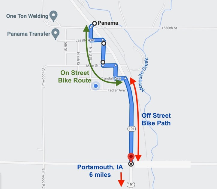The trail starts at the north end of Panama in Whispering Pines Park – just across State Highway 191 from the Panama ballpark. The current end point is the intersection of State Highway 191 and County Road F32. The eventual south end will be just past the Portsmouth Iowa ballpark about 7 miles away.