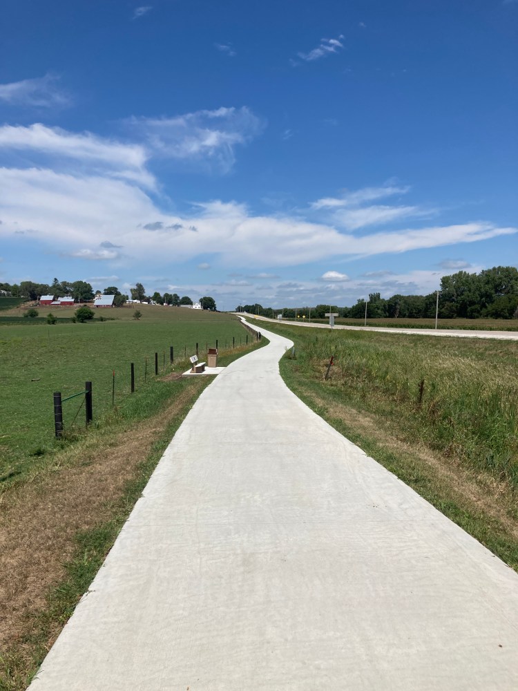 The trail starts at the north end of Panama in Whispering Pines Park – just across State Highway 191 from the Panama ballpark. It currently ends 1 mile south at the intersection of State Highway 191 and County Road F32. The eventual south end will be just past the Portsmouth Iowa ballpark about 7 miles away.