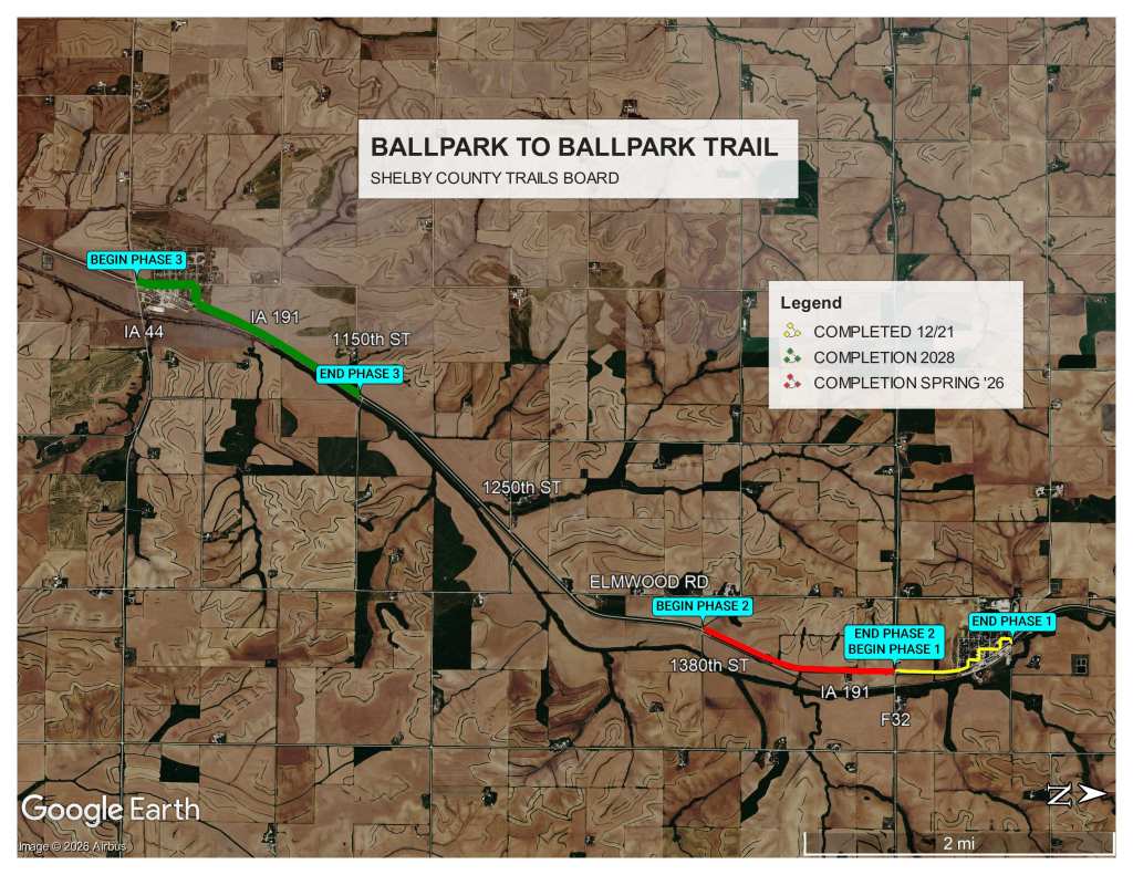 The trail starts at the north end of Panama in Whispering Pines Park – just across State Highway 191 from the Panama ballpark. The south end will be just past the Portsmouth Iowa ballpark about 7 miles away.